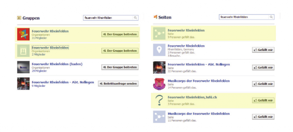 Abbildung 22: Facebook Gruppen und Seiten der Feuerwehr Rheinfelden