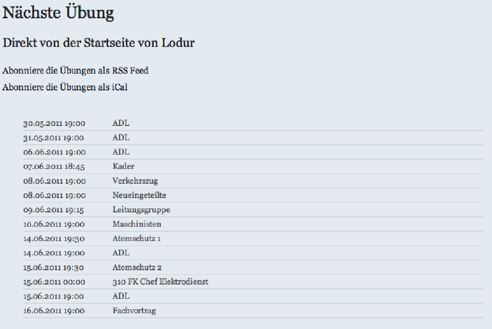 Bei LODUR 2 ical (sprich: LODUR to iCal) handelt es sich um ein Plugin, welches die Daten von der LODUR Startseite auf den Prototypen der Webseite bringt. Somit kann sich der AdF direkt auf der Webseite die nächsten Übungen anschauen.