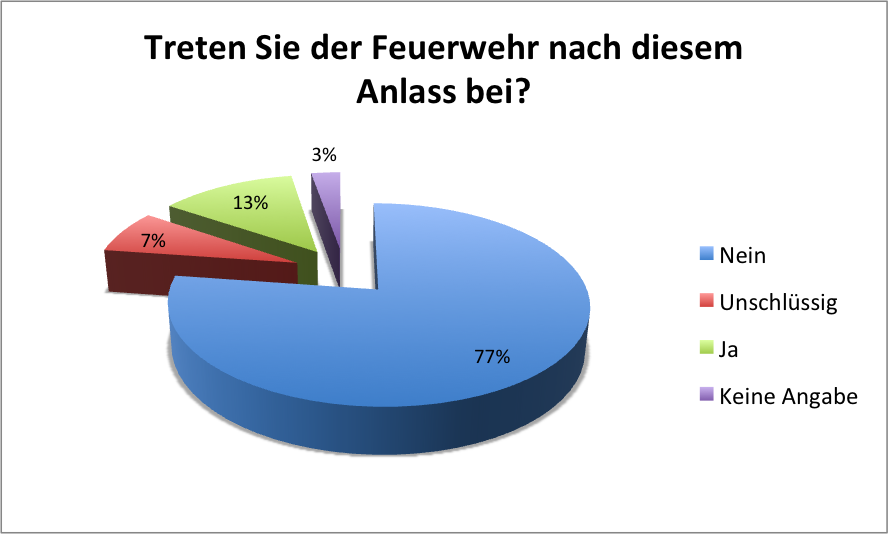 Leider ist das Resultat ernüchternd, denn 77% werden nicht der Feuerwehr Rheinfelden beitreten. Nur 13% werden der Feuerwehr beitreten. Zu dieser Zahl kann gesagt werden, dass es sich um Personen handelt, die volljährig wurden und bereits in der Jugendfeuerwehr dabei waren. 7% müssen es sich noch überlegen.