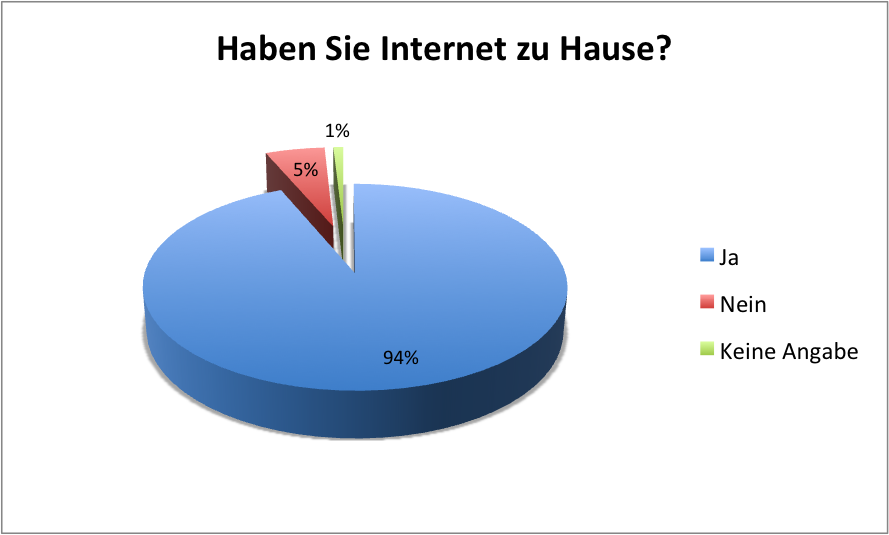 Gemäss einer Studie des BFS [BFS03, Vgl. Entwicklung] benutzen 83.9% der Bevölkerung ab 14 Jahren das Internet, daher ist es kaum verwunderlich, dass 94% der Befragten einen Internetanschluss zu Hause haben.