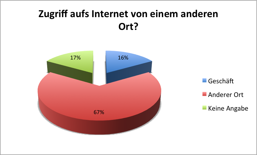 67% gaben einen anderen Ort an, an dem Sie auf das Internet zugreifen können. 16% können auf der Arbeit das Internet benutzen. Die restlichen Personen bezogen keine Stellung. Die Gründe hierfür sind dem Autor nicht bekannt, da die Anonymität gewährleistet wurde.